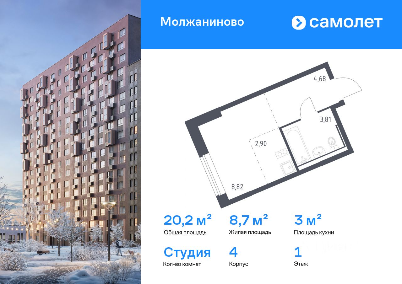Строим кварталы для жизни с заботой о будущем. Предлагается квартира студия комфорт-класса 20,21 кв.м в корпусе 4 на 1 этаже, в ЖК "Молжаниново"
