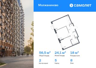 Строим кварталы для жизни с заботой о будущем. Предлагается 2-комнатная квартира комфорт-класса 56,51 кв.м в корпусе 5 на 8 этаже, в ЖК "Молжаниново"