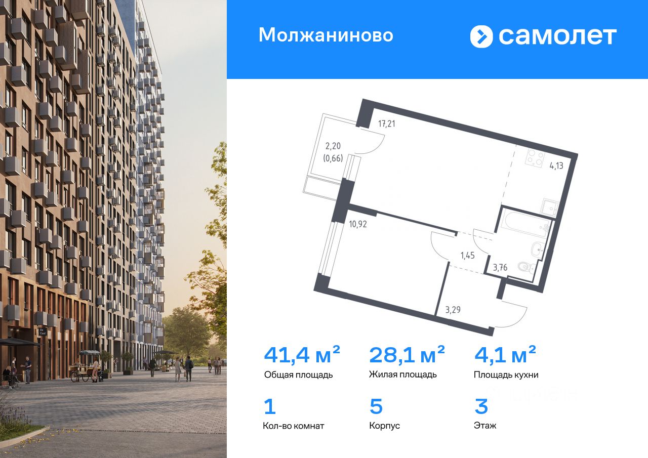 Строим кварталы для жизни с заботой о будущем. Предлагается 1-комнатная квартира комфорт-класса 41,42 кв.м в корпусе 5 на 3 этаже, в ЖК "Молжаниново"