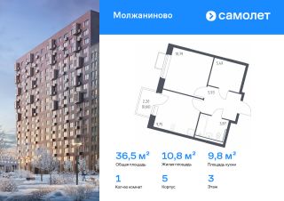 Строим кварталы для жизни с заботой о будущем. Предлагается 1-комнатная квартира комфорт-класса 36,49 кв.м в корпусе 5 на 3 этаже, в ЖК "Молжаниново"