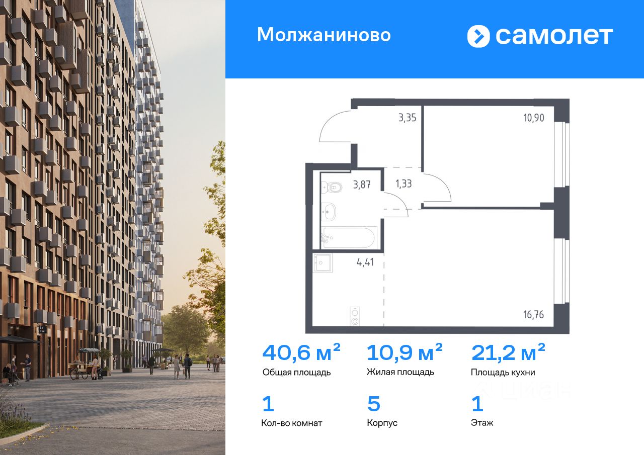 Строим кварталы для жизни с заботой о будущем. Предлагается 1-комнатная квартира комфорт-класса 40,62 кв.м в корпусе 5 на 1 этаже, в ЖК "Молжаниново"