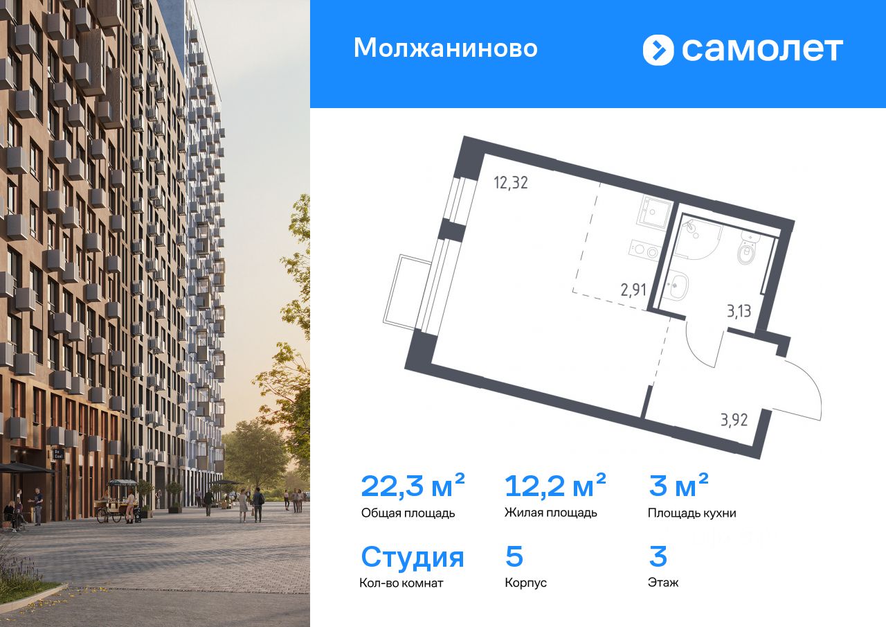 Строим кварталы для жизни с заботой о будущем. Предлагается квартира студия комфорт-класса 22,28 кв.м в корпусе 5 на 3 этаже, в ЖК "Молжаниново"