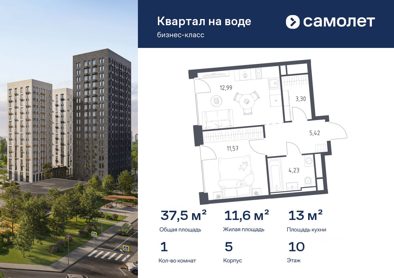 Строим кварталы для жизни с заботой о будущем. Предлагается 1-комнатная квартира бизнес-класса 37,51 кв.м в корпусе 5 на 10 этаже, в ЖК "Квартал на воде"