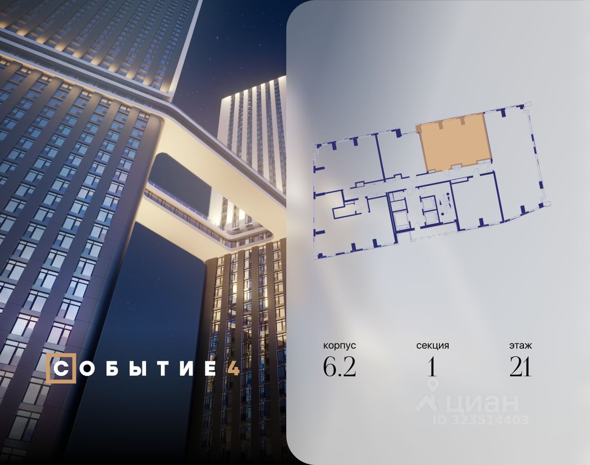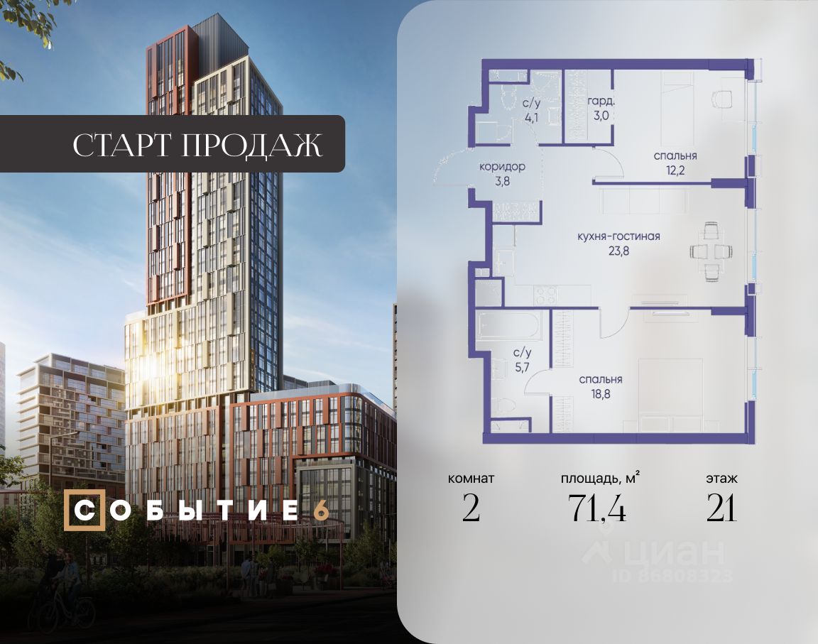 Продаётся 2-комнатная квартира от застройщика: общая площадь 71.40 м², жилая 31.00 м², кухня 23.80 м², 21-й этаж, жилой квартал "Событие-6", корпус 2 (секция 1) Срок сдачи: 1 квартал 2029 года.