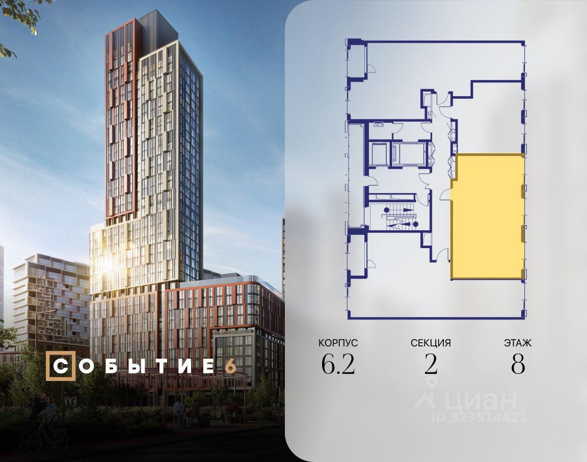 Продаётся 2-комнатная квартира от застройщика: общая площадь 62.30 м², жилая 28.80 м², кухня 22.10 м², 8-й этаж, жилой квартал "Событие-6", корпус 2 (секция 2) Срок сдачи: 1 квартал 2029 года.