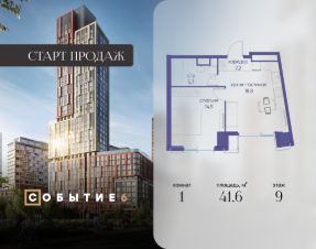 Продаётся 1-комнатная квартира от застройщика: общая площадь 41.60 м², жилая 14.90 м², кухня 18.80 м², 9-й этаж, жилой квартал "Событие-6", корпус 2 (секция 5) Срок сдачи: 1 квартал 2029 года.