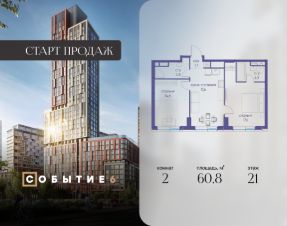 Продаётся 2-комнатная квартира от застройщика: общая площадь 60.80 м², жилая 32.20 м², кухня 17.60 м², 21-й этаж, жилой квартал "Событие-6", корпус 2 (секция 5) Срок сдачи: 1 квартал 2029 года.