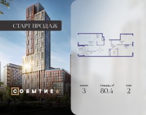Продаётся 3-комнатная квартира от застройщика: общая площадь 80.40 м², жилая 43.00 м², кухня 20.70 м², 2-й этаж, жилой квартал "Событие-6", корпус 2 (секция 3) Срок сдачи: 1 квартал 2029 года.