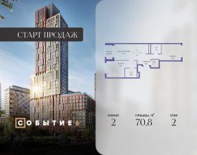 Продаётся 2-комнатная квартира от застройщика: общая площадь 70.80 м², жилая 30.30 м², кухня 21.80 м², 2-й этаж, жилой квартал "Событие-6", корпус 2 (секция 2) Срок сдачи: 1 квартал 2029 года.