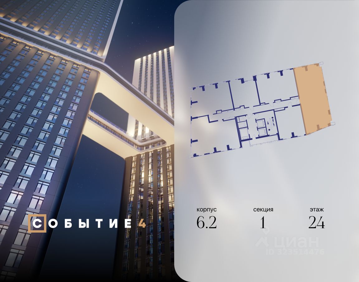 Продаётся 4-комнатная квартира от застройщика: общая площадь 111.50 м², жилая 54.90 м², кухня 24.00 м², 24-й этаж, жилой квартал "Событие-6", корпус 2 (секция 1) Срок сдачи: 1 квартал 2029 года.