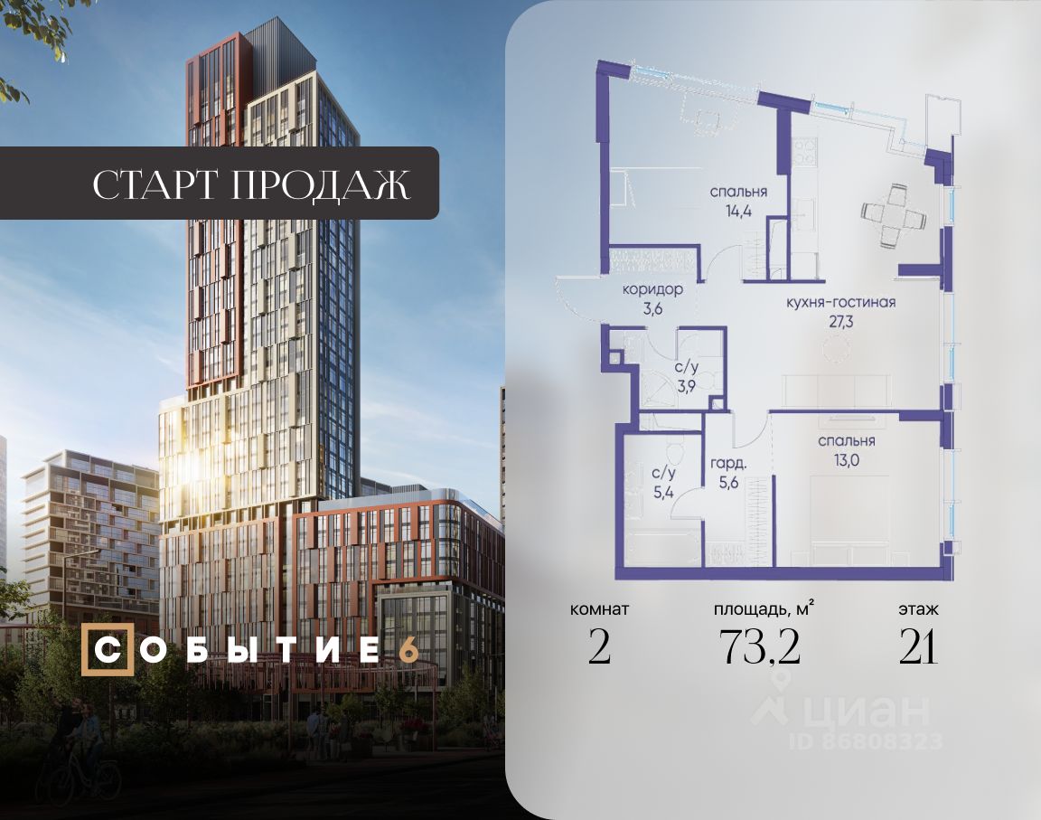 Продаётся 2-комнатная квартира от застройщика: общая площадь 73.20 м², жилая 27.40 м², кухня 27.30 м², 21-й этаж, жилой квартал "Событие-6", корпус 2 (секция 1) Срок сдачи: 1 квартал 2029 года.