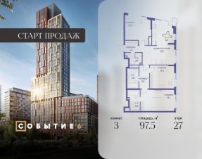 Продаётся 3-комнатная квартира от застройщика: общая площадь 97.50 м², жилая 46.50 м², кухня 27.50 м², 27-й этаж, жилой квартал "Событие-6", корпус 2 (секция 1) Срок сдачи: 1 квартал 2029 года.