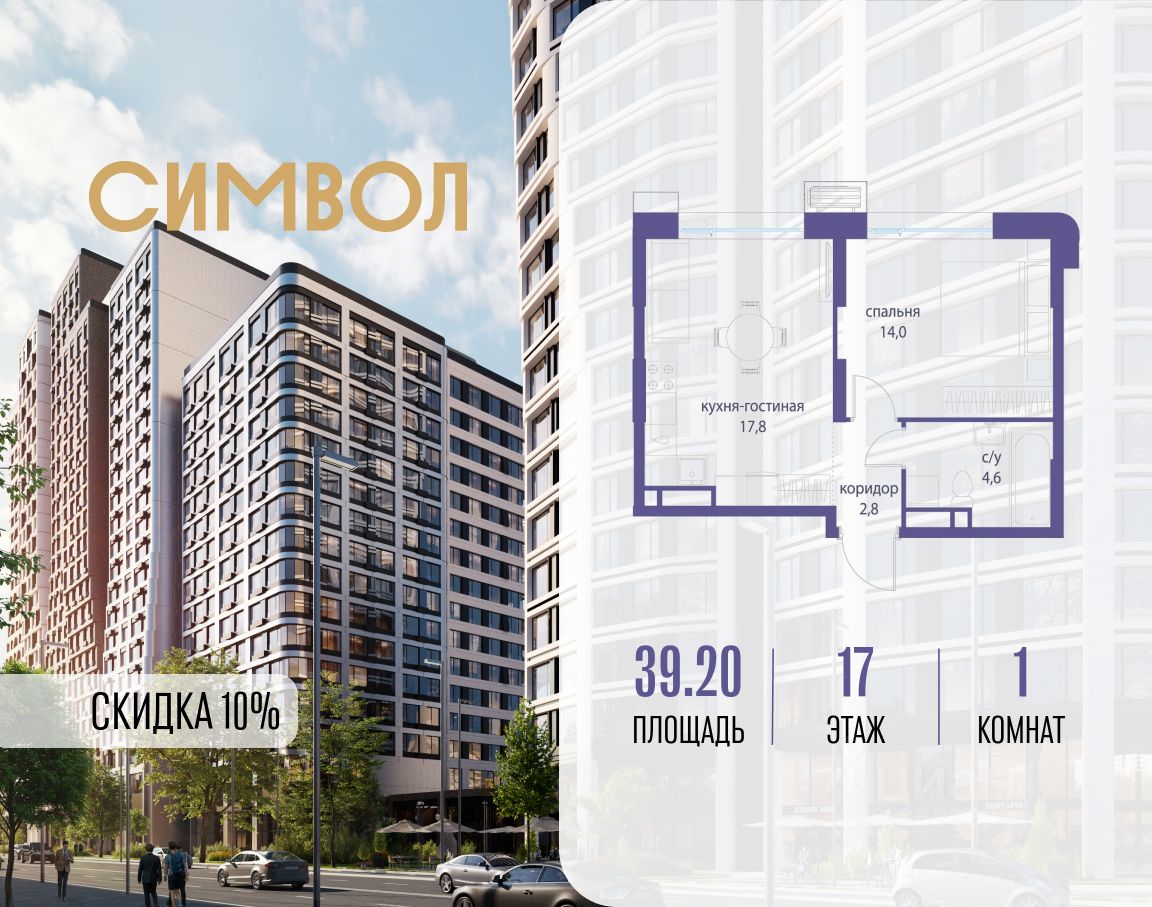 Продается 1-комнатная квартира от застройщика: общая площадь 39.20 м², жилая 14.00 м², кухня 17.80 м², 17-й этаж, жилой квартал "Гордость", корпус 36 (секция 2). Срок сдачи: 2 квартал 2029 года.