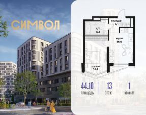 Продается 1-комнатная квартира от застройщика: общая площадь 44.10 м², жилая 16.20 м², кухня 16.60 м², 13-й этаж, жилой квартал "Вдохновение", корпус 33 (секция 1). Срок сдачи: 4 квартал 2027 года.