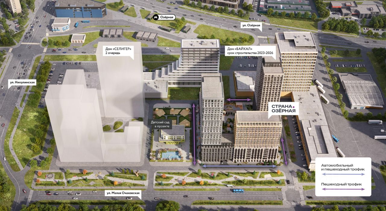 Жилой комплекс ЖК "Страна.Озёрная" новое пространство для жизни и вдохновения на карте Москвы в престижном Западном округе, где есть все для комфортной жизни: магазины и полезные сервисы, консьерж-сервис, просторное гранд-лобби и детский сад. Архитектура комплекса гармонирует с природой вокруг и дополняет городское пространство. Даже подсветка фасадов работает на воплощение главной идеи: баланс между городом и природой.