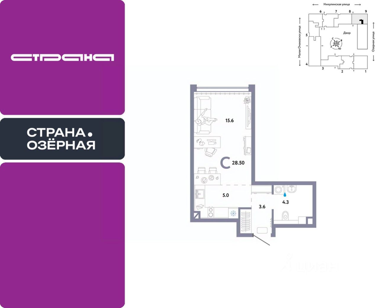 1комнатная квартира площадью 28,5 кв. м на 8 этаже в доме "Байкал" жилого комплекса "Страна.Озёрная" . Срок сдачи дома - 3 квартал 2025 года.