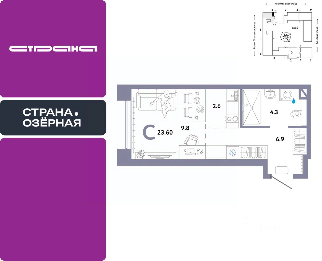 1комнатная квартира площадью 23,6кв. м. на 9этаже в доме "Байкал" жилого комплекса "Страна.Озёрная" . Срок сдачи дома - 2 квартал 2026 года.
