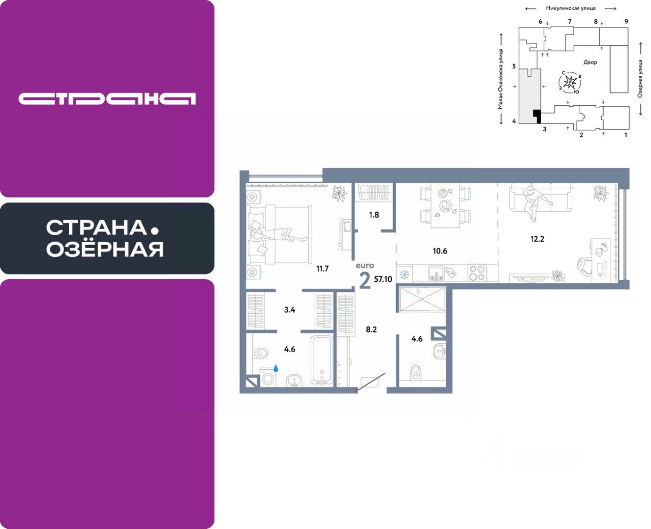 2комнатная квартира площадью 57,1кв. м. на 9этаже в доме "Байкал" жилого комплекса "Страна.Озёрная" . Срок сдачи дома - 2 квартал 2026 года.