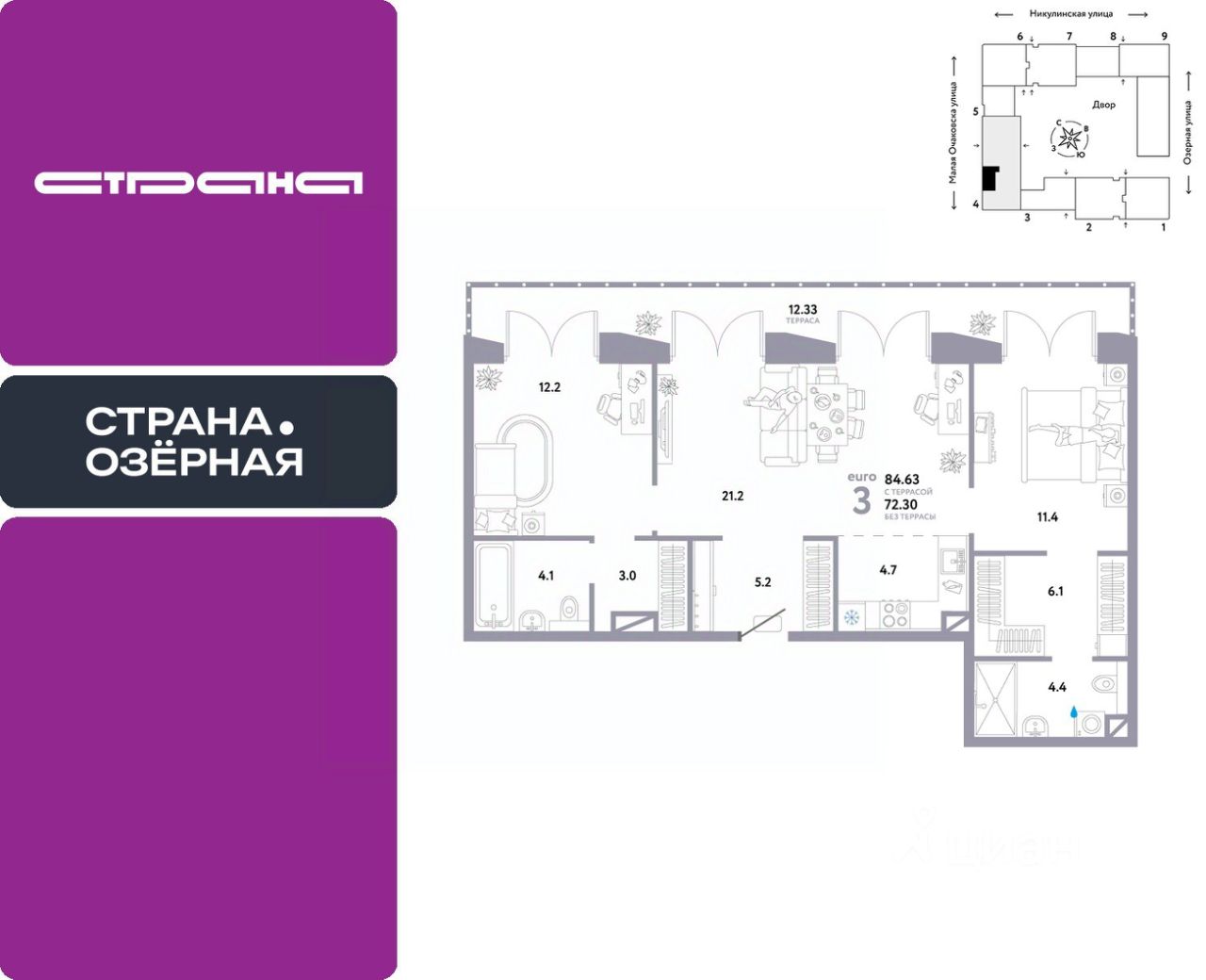 3комнатная квартира площадью 84,63кв. м. на 19этаже в доме "Байкал" жилого комплекса "Страна.Озёрная" . Срок сдачи дома - 2 квартал 2026 года.