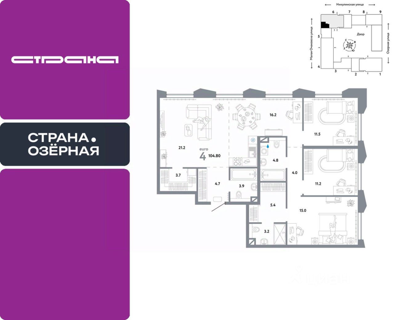 4комнатная квартира площадью 104,8кв. м. на 30этаже в доме "Байкал" жилого комплекса "Страна.Озёрная" . Срок сдачи дома - 2 квартал 2026 года.
