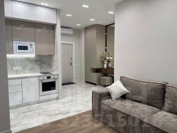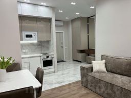 Квартира полностью готова для проживания и оснащена всем необходимым: элитный ремонт с многоуровневым освещением, тёплыми полами, кондиционерами, а также дорогой мебелью и техникой.С лоджии открывается великолепный вид, что позволяет наслаждаться прекрасными закатами. Во дворе расположена современная детская площадка с подогреваемыми скамейками и экзотическими растениями.