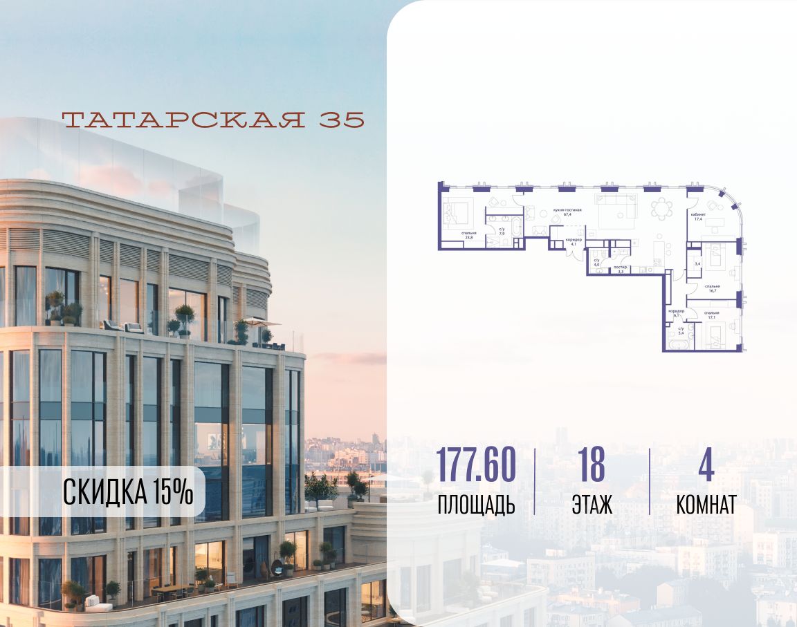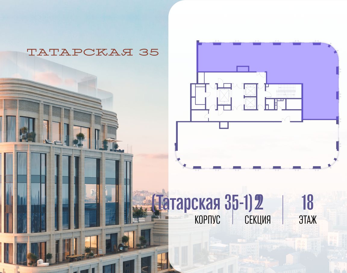 ТАТАРСКАЯ, 35 - новая архитектурная доминанта Замоскворечья, достопримечательность на фотопанорамах исторического центра Москвы. Элитный дом, созданный для тех, кто умеет смотреть далеко вперед, мыслить масштабно и воплощать собственный сценарий жизни.