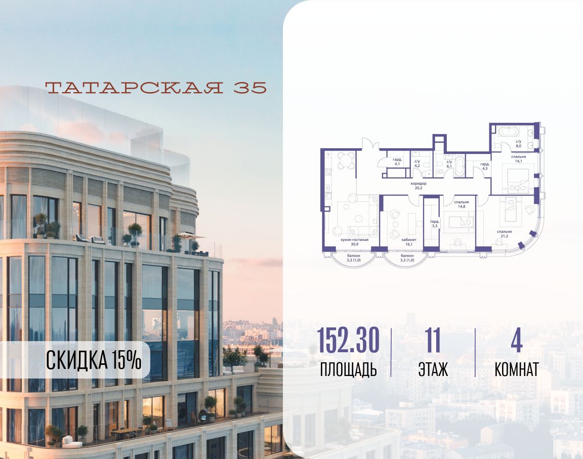Продается просторная квартира площадью 152.30 м2 в жилом комплексе ТАТАРСКАЯ, 35. Квартира находится в 1 секции корпуса 1. Этаж 11-й из 20.