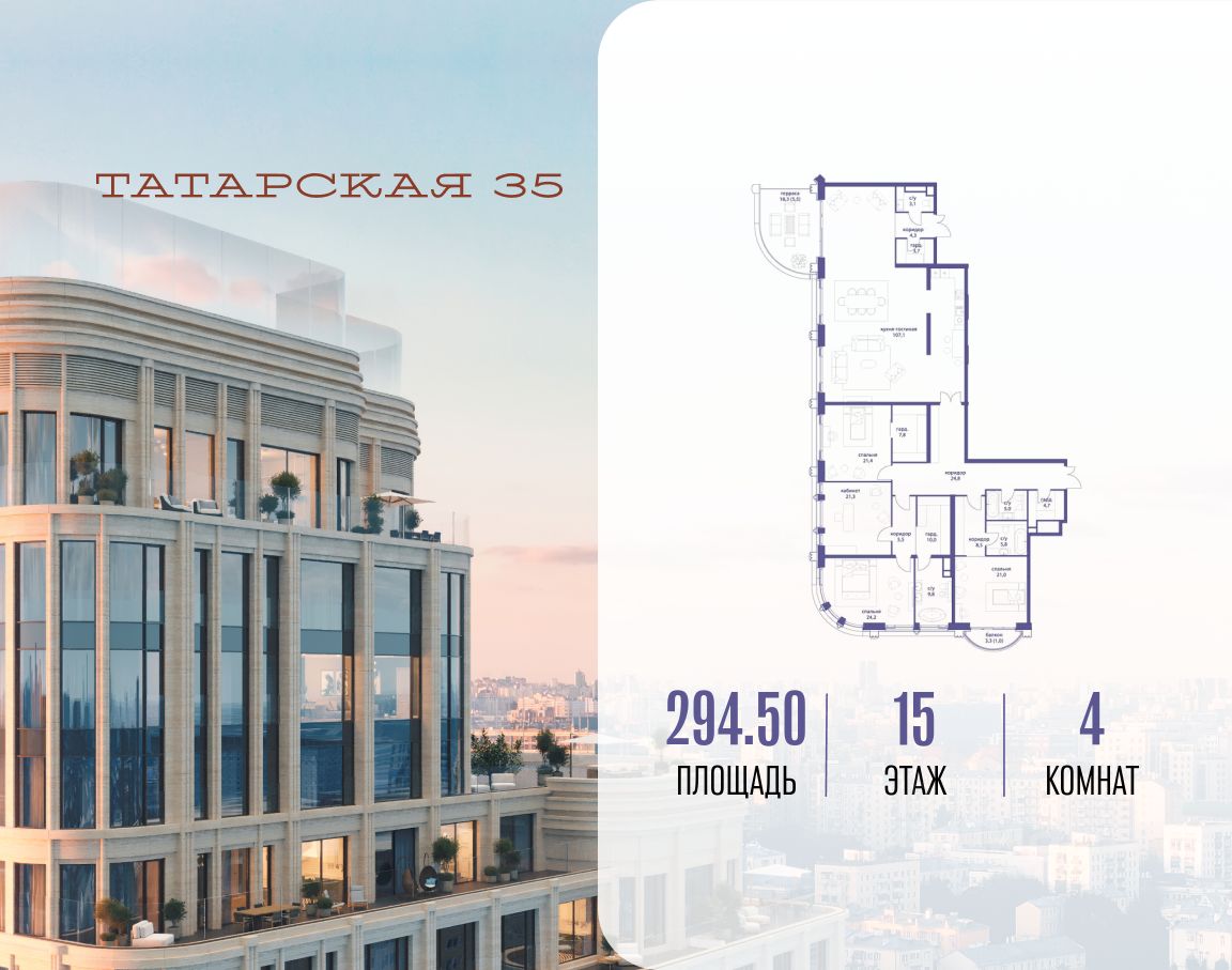 Продается просторная квартира площадью 294.50 м2 в жилом комплексе ТАТАРСКАЯ, 35. Квартира находится в 1 секции корпуса 1. Этаж 15-й из 20.
