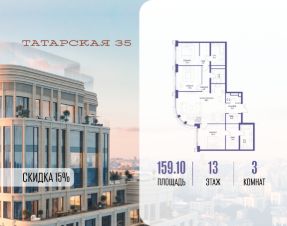 Продается просторная квартира площадью 159.10 м2 в жилом комплексе ТАТАРСКАЯ, 35. Квартира находится в 1 секции корпуса 1. Этаж 13-й из 20.