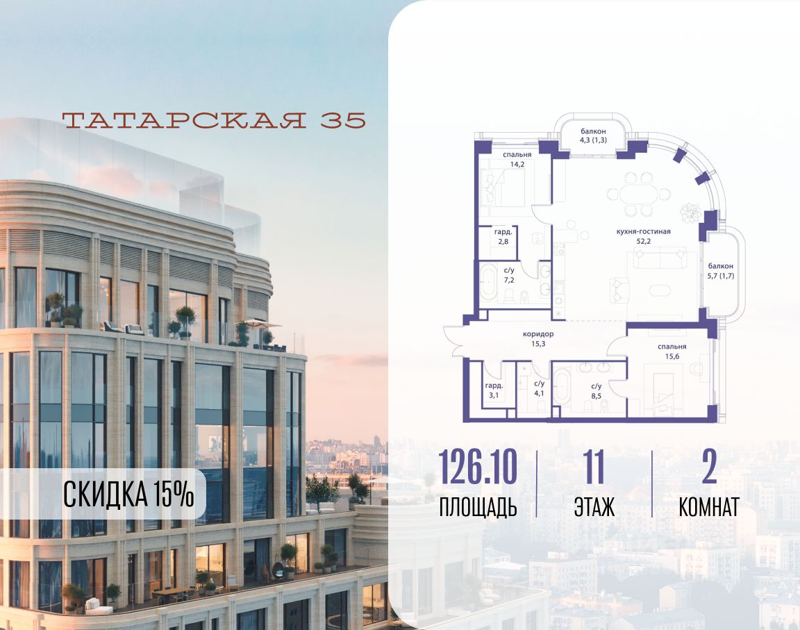 Продается просторная квартира площадью 126.10 м2 в жилом комплексе ТАТАРСКАЯ, 35. Квартира находится в 1 секции корпуса 3. Этаж 11-й из 24.