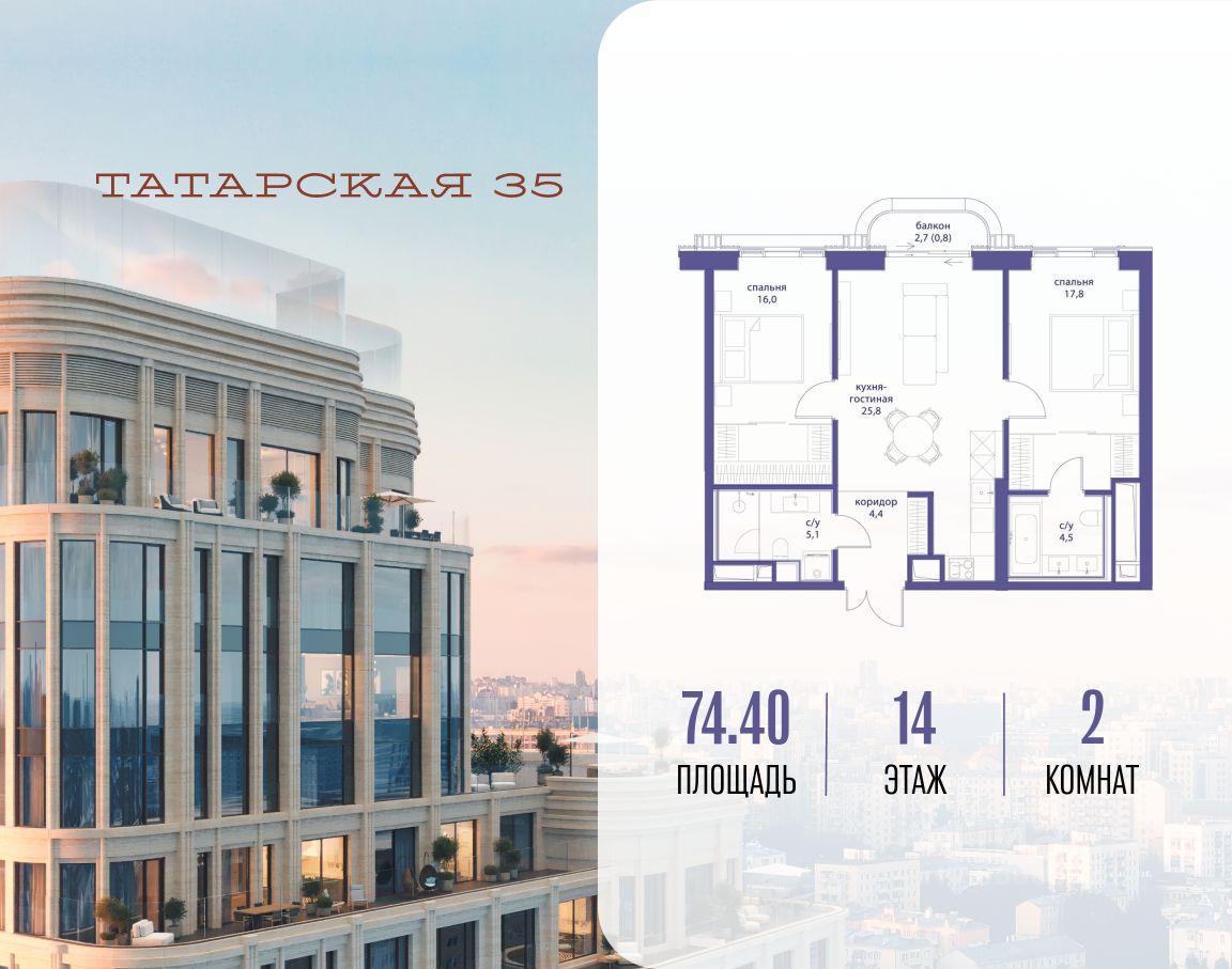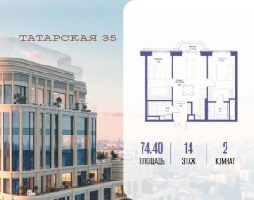 Продается просторная квартира площадью 74.40 м2 в жилом комплексе ТАТАРСКАЯ, 35. Квартира находится в 2 секции корпуса 3. Этаж 14-й из 23. Квартира без чистовой отделки, с просторной кухней 25.80 м2. Жилая площадь 33.80 м2. Высота потолка от 3.50. ТАТАРСКАЯ, 35 - новая архитектурная доминанта Замоскворечья, достопримечательность на фотопанорамах исторического центра Москвы. Элитный дом, созданный для тех, кто умеет смотреть далеко вперед, мыслить масштабно и воплощать собственный сценарий жизни. Вдохновляющие прогулки по променаду набережной, в уютных переулках, в парке "Зарядье", в Михайловском саду и Репинском сквере. Наслаждение высоким искусством в Третьяковской галерее, Доме Музыки, театральном музее им. А.А. Бахрушина, театре на Малой Ордынке. За окнами - Кремль, высотка на Котельнической, панорамы Замоскворечья и острова Балчуг, огни Садового кольца. Собственные спорт-румы, детская, репетиторская, бьюти-пространства, деловое пространство с коворкингом, переговорной и сигарной. Собственный трехуровневый фитнесс-центр с бассейном, тренажерным залом, сауной, хаммамом, массажным кабинетом. Площадь двора - 1,8 га, половина территории покрыта деревьями, кустарниками и лужайками. Дом расположен внутри Садового кольца - отсюда в считанные минуты можно добраться до важнейших мест столицы: достопримечательностей и парков, театров и ресторанов, деловых и административных центров. 7 минут до Кремля на автомобиле, 15 минут до Третьяковской галереи и 8 минут до Садового кольца пешком. Планировочные решения и визуализации предварительны, возможны изменения.