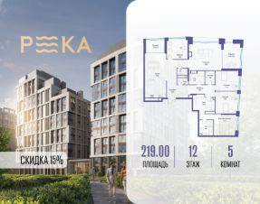 Продается просторная квартира площадью 219.00 м2 в жилом комплексе РЕКА. Квартира находится в 4 секции корпуса 3 (будет введен в эксплуатацию в 4 кв. 2026). Этаж 12-й из 14.