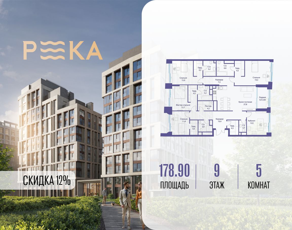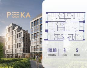 Продается просторная квартира площадью 178.90 м2 в жилом комплексе РЕКА. Квартира находится в 1 секции корпуса 3 (будет введен в эксплуатацию в 4 кв. 2026). Этаж 9-й из 16.