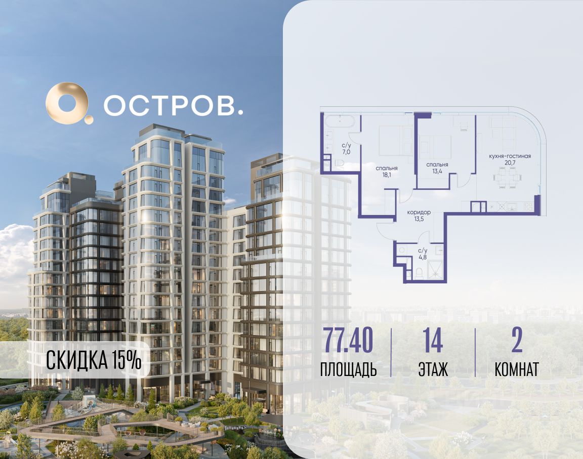 Продаётся 2-комн. квартира от застройщика: общая площадь 77.40 м², жилая 31.50 м², кухня 20.70 м², 14-й этаж, жилой квартал "Остров 12", корпус 3 (секция 1). Срок сдачи: 1 квартал 2029 года.