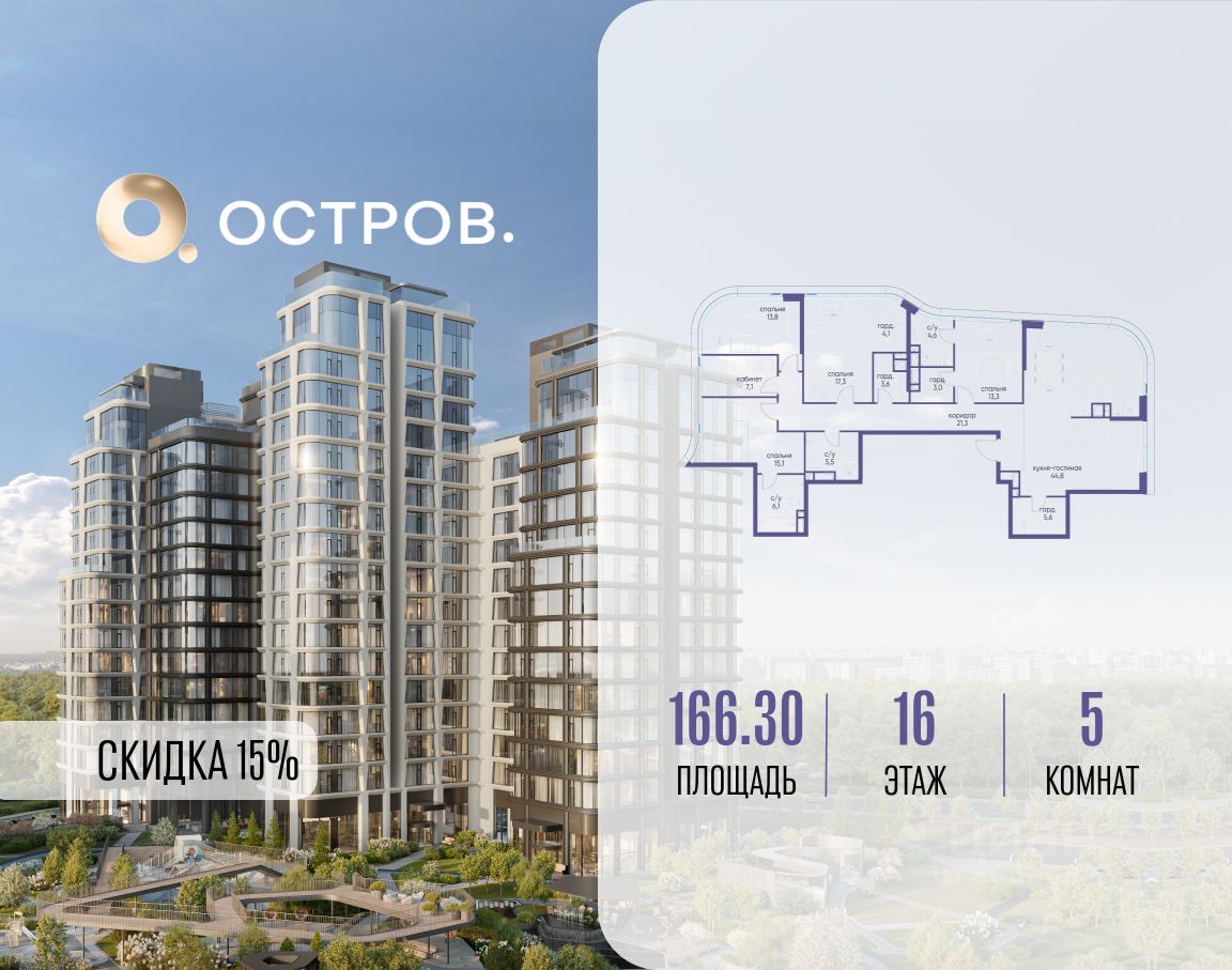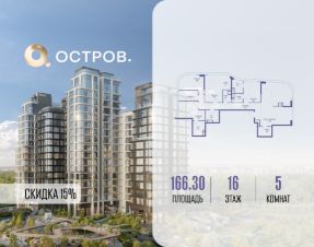 Продаётся квартира от застройщика: общая площадь 166.30 м², жилая 66.60 м², кухня 44.80 м², 16-й этаж, жилой квартал "Остров 12", корпус 3 (секция 1). Срок сдачи: 1 квартал 2029 года.