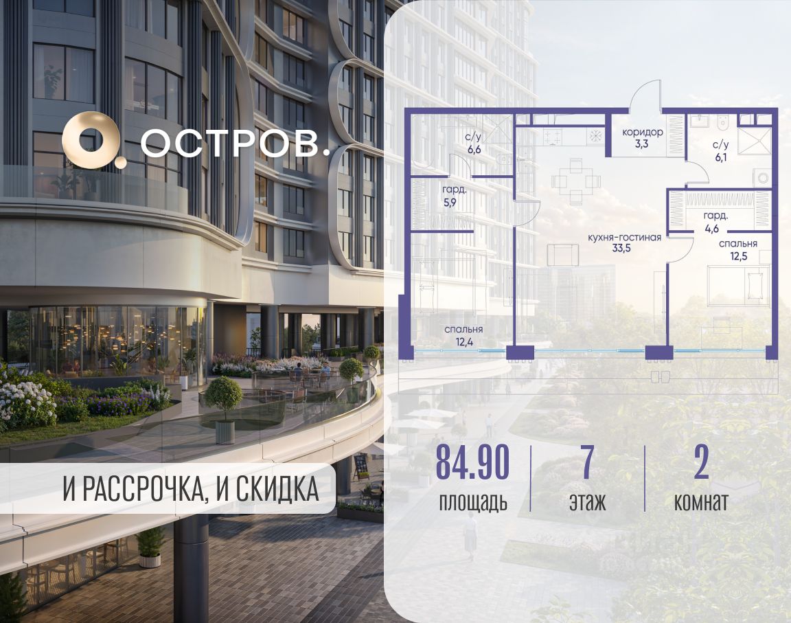 Продаётся двухкомнатная квартира от застройщика: общая площадь 84.90 м², жилая 24.90 м², кухня 33.50 м², 7, жилой квартал "Остров 7", корпус 6 (7 квартал) (секция 1). срок сдачи: 4-кв. 2025.