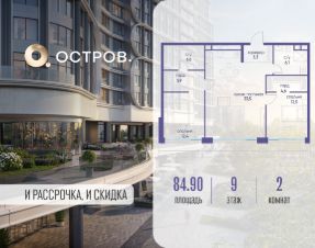 Продаётся двухкомнатная квартира от застройщика: общая площадь 84.90 м², жилая 24.90 м², кухня 33.50 м², 9, жилой квартал "Остров 7", корпус 6 (7 квартал) (секция 1). срок сдачи: 4-кв. 2025.