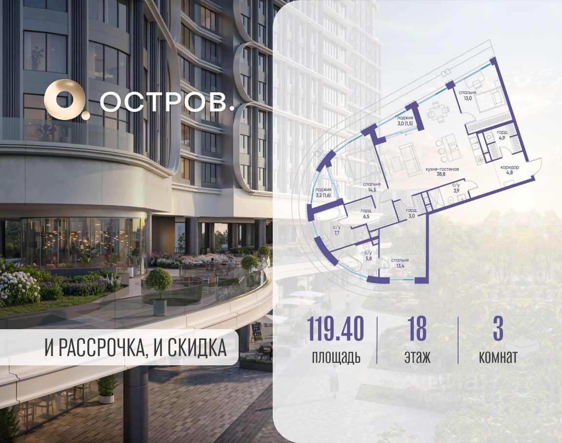 Продаётся трехкомнатная квартира от застройщика: общая площадь 119.40 м², жилая 40.90 м², кухня 38.80 м², 18, жилой квартал "Остров 7", корпус 6 (7 квартал) (секция 2). срок сдачи: 4-кв. 2025.