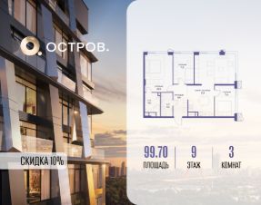 Продаётся 3-комн. квартира от застройщика: общая площадь 99.70 м², жилая 43.10 м², кухня 37.20 м², 9-й этаж, жилой квартал "Остров 12", корпус 2 (секция 1). Срок сдачи: 1 квартал 2029 года.