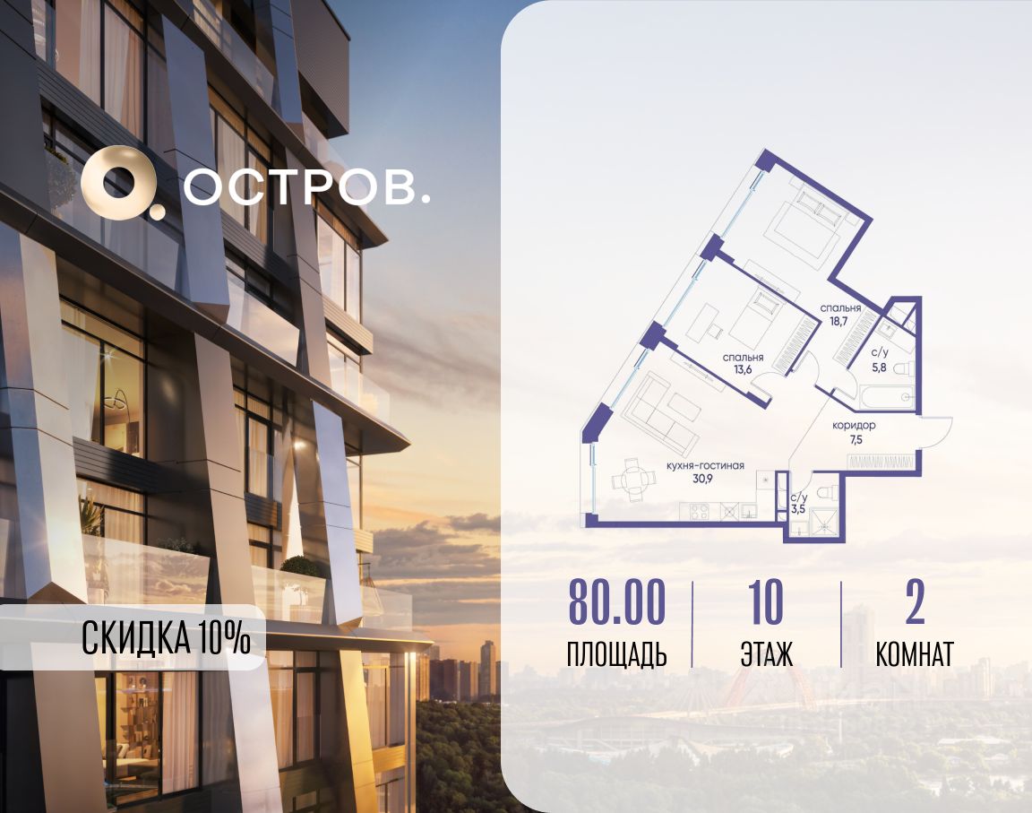 Продаётся двухкомнатная квартира от застройщика: общая площадь 80.00 м², жилая 32.30 м², кухня 30.90 м², 10, жилой квартал "Остров 12", корпус 1 (12.1 квартал) (секция 1). срок сдачи: 4-кв. 2025.