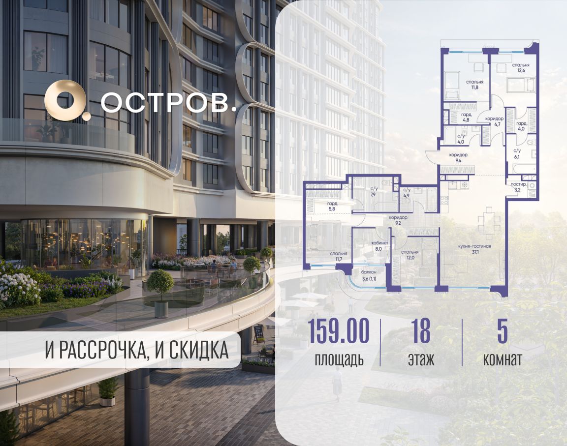 Продаётся многокомнатная квартира от застройщика: общая площадь 159.00 м², жилая 56.10 м², кухня 37.10 м², 18, жилой квартал "Остров 7", корпус 2 (7 квартал) (секция 3). срок сдачи: 4-кв. 2025.
