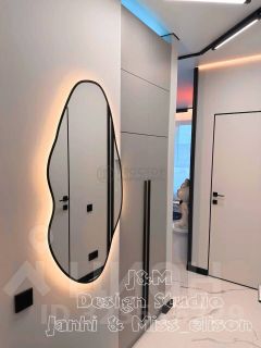 При входе мы разместили видеоглазок, который помогает следить за безопасностью квартиры и её жителей. Далее домофон, его по желанию тоже можно сделать видео. Далее необычное дизайнерское зеркало с подсветкой (клякса), шкаф до потолка для верхней одежды, что очень удобно.