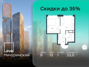 В жилом квартале, расположенном на границе с природным заказником "Долина реки Очаковки", продаётся 1-комнатная квартира площадью 33.50 кв.м без отделки. Квартира расположена на 13 этаже 48-этажного корпуса 8 в жилом комплексе бизнес-класса Level Мичуринский (компания Level Group/Левел групп).