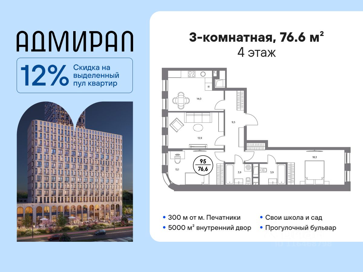В динамично развивающемся районе Москвы, всего в 300 метрах от метро и в пешей близости от нового городского порта с протяженной набережной 13 км, свободной от автомобилей, продается 3-комнатная квартира площадью 76.60 м². без отделки.