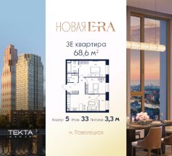 3-комн. квартира в ЖК "Era" на 33 этаже в 52 этажном здании Корпус 5. Общая площадь: 68.6 кв.м., жилая: 42.00 кв.м. Высота потолков 3.30 м.