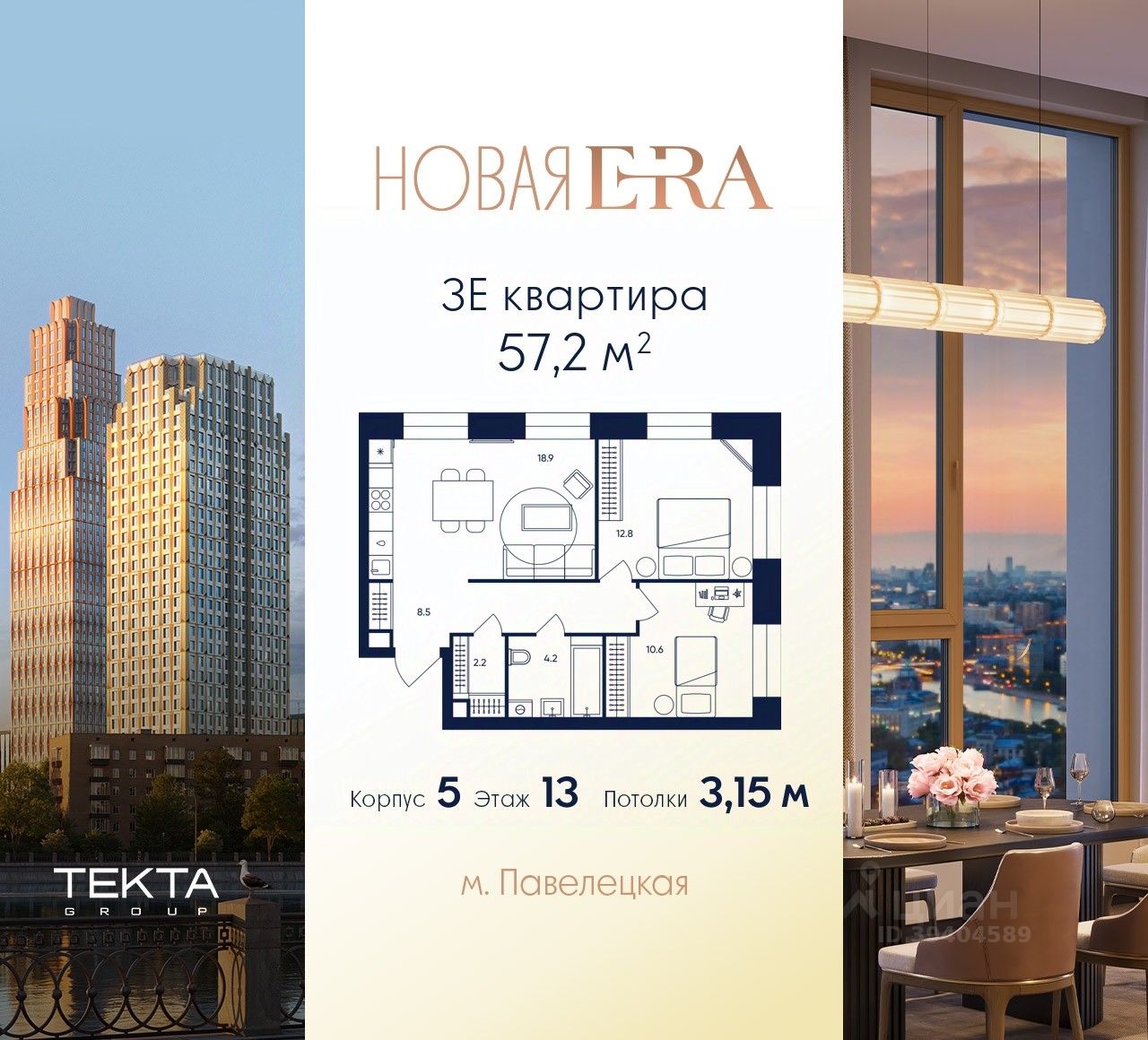 3-комн. квартира в ЖК "Era" на 13 этаже в 52 этажном здании Корпус 5. Общая площадь: 57.2 кв.м., жилая: 35.40 кв.м. Высота потолков 3.15 м.