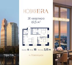 3-комн. квартира в ЖК "Era" на 18 этаже в 37 этажном здании Корпус 6. Общая площадь: 61.5 кв.м., жилая: 40.80 кв.м. Высота потолков 3.15 м.