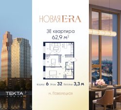 3-комн. квартира в ЖК "Era" на 32 этаже в 37 этажном здании Корпус 6. Общая площадь: 62.9 кв.м., жилая: 38.90 кв.м. Высота потолков 3.30 м.