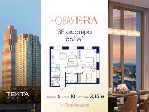 3-комн. квартира в ЖК "Era" на 10 этаже в 37 этажном здании Корпус 6. Общая площадь: 66.1 кв.м., жилая: 39.10 кв.м. Высота потолков 3.15 м.