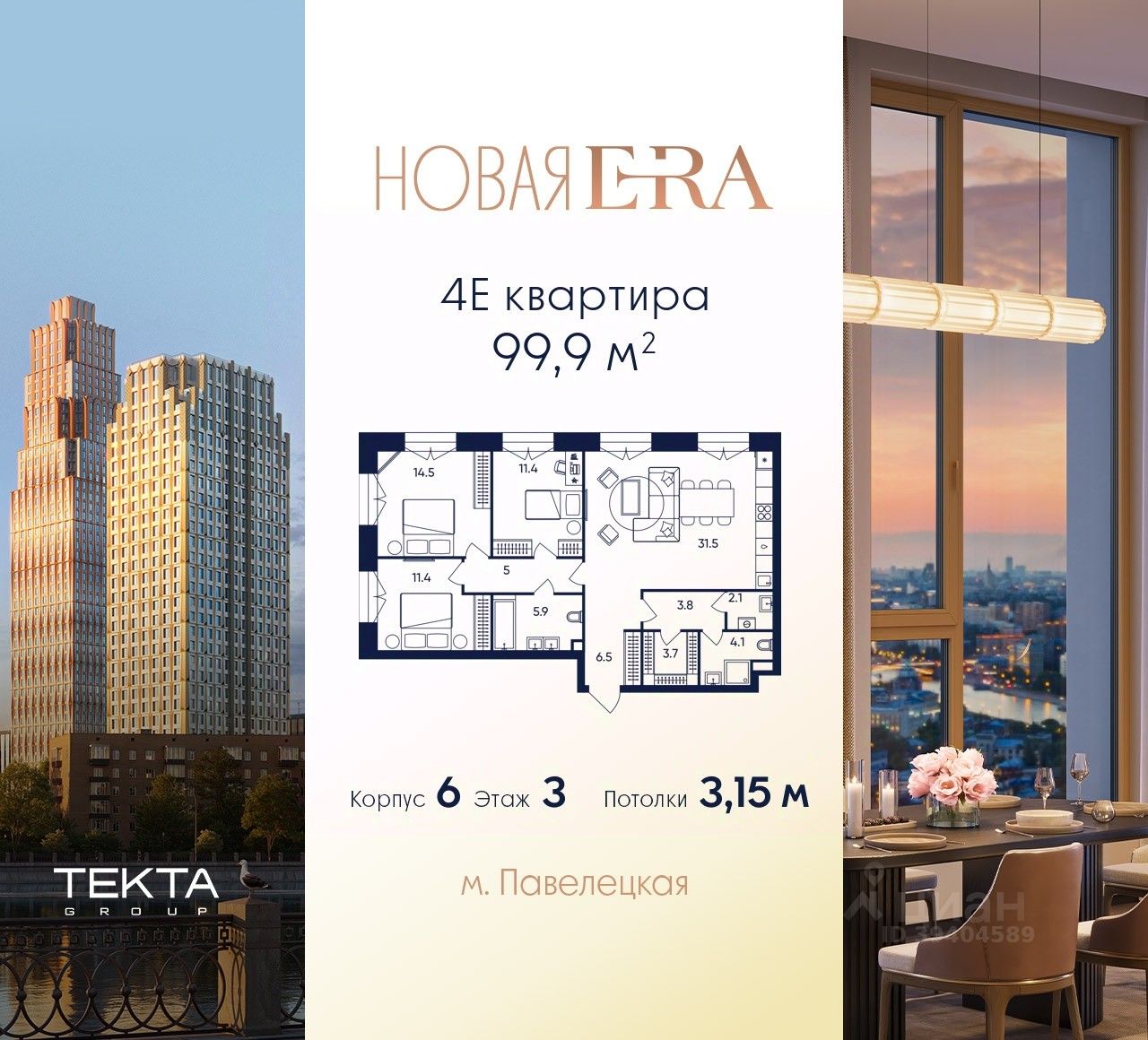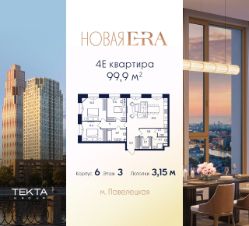 4-комн. квартира в ЖК "Era" на 3 этаже в 37 этажном здании Корпус 6. Общая площадь: 99.9 кв.м., жилая: 60.80 кв.м. Высота потолков 3.15 м.